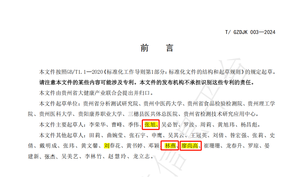 《贵药膳贵药饮产品认定通则》,本标准文件由贵州省大健康产业联合会发布,该标准主要起草人有我工程中心张旭副教授,参与起草人有廖尚高教授和林燕副教授,该团体标准于2024年12月22日开始实施。