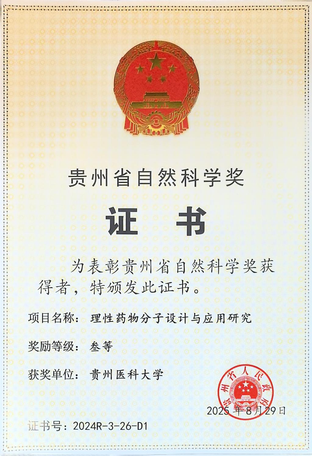 本工程中心周孟教授2025年获贵州省自然科学奖三等奖,获奖项目名称:理性药物分子设计与应用研究。